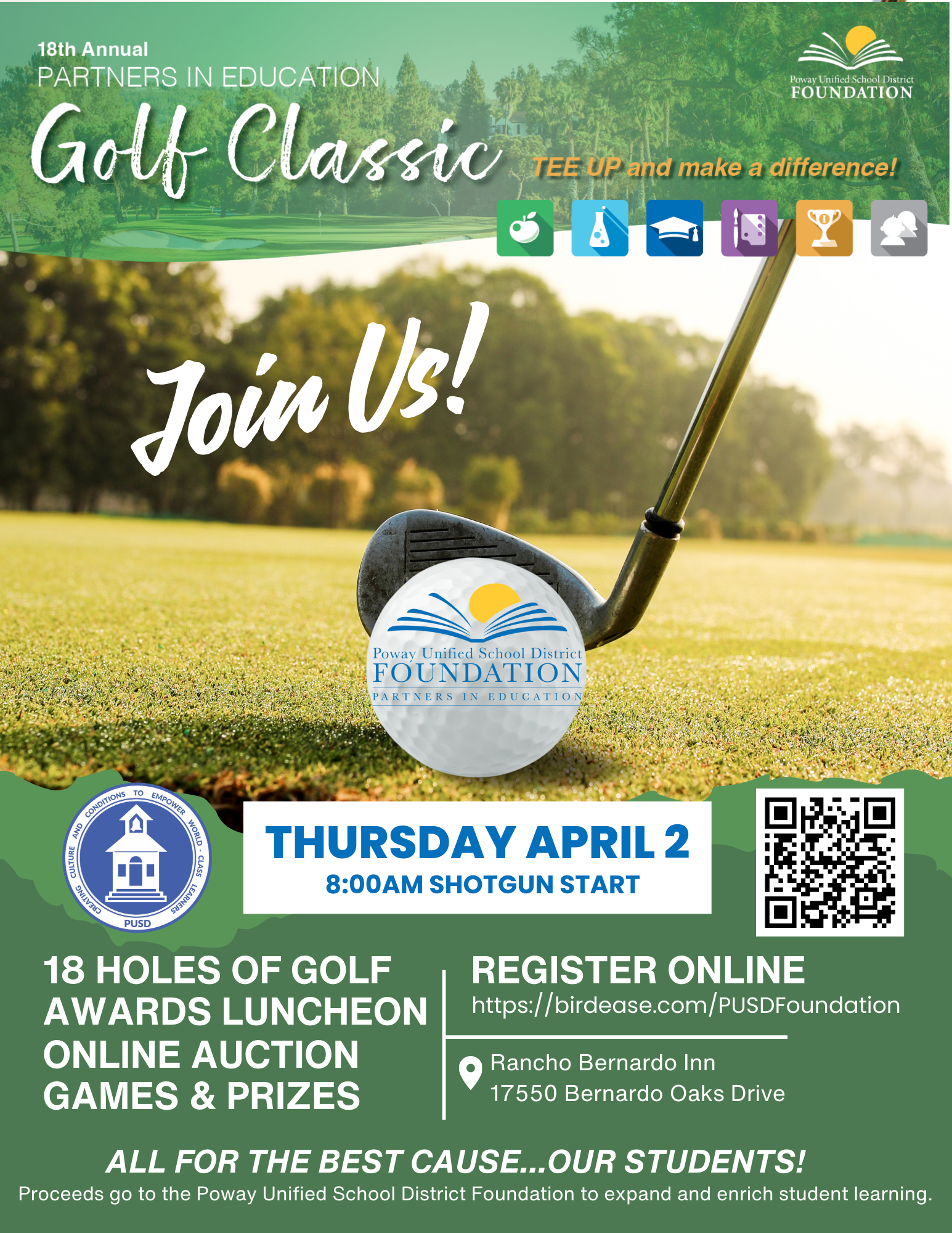With your help, we can reach our goal to raise $75,000. The Poway Unified School District prepares more than 34,000 students for college and career readiness each year. Your participation in the Annual Golf Classic will provide support to our Science, Technology, Engineering, Arts and Math (STEAM) initiatives and help to provide enhanced resources and experiences for students in and outside of the classroom. The PUSD Foundation provides grants to PUSD school sites for District-aligned educational initiatives in STEAM education, High Quality Instruction, Student Belonging and College & Career Readiness.
