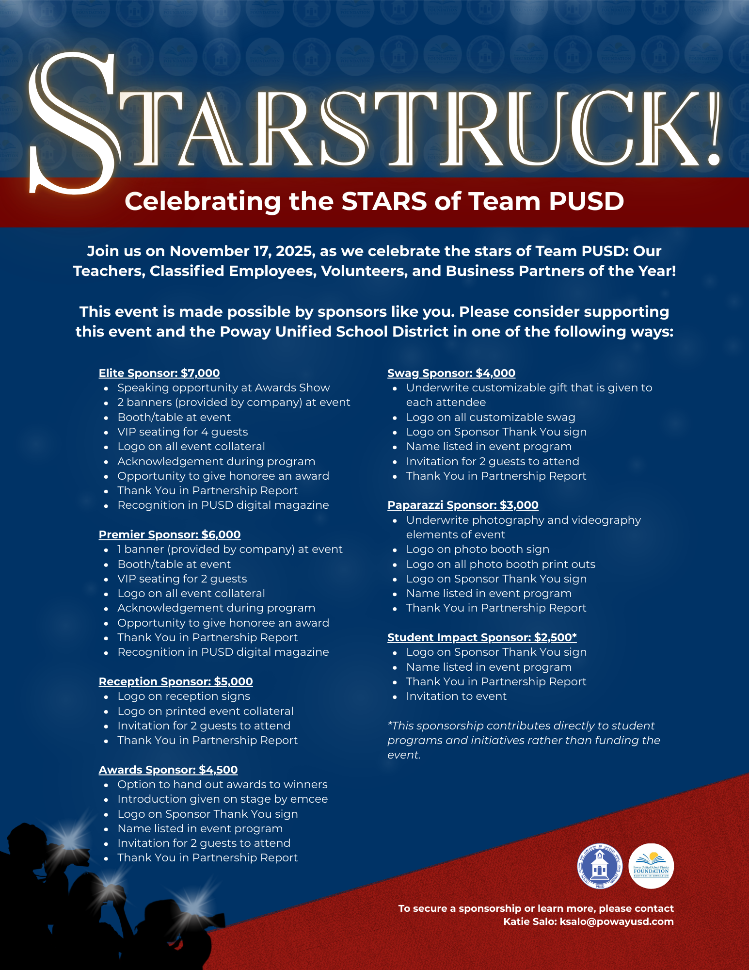 Take a walk down the red carpet and join Poway Unified as we celebrate the stars of the night: District Teachers of the Year, Classified Employees of the Year, and Volunteers of the Year. Starstruck! is an Oscar-style ceremony featuring entertainment and award recognition.